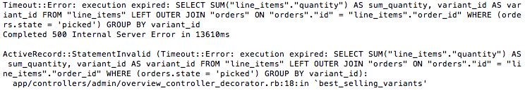 Let’s take a closer look at the earlier database timeout code. It came from Admin Dashboard and admin/overview_controller.rb.