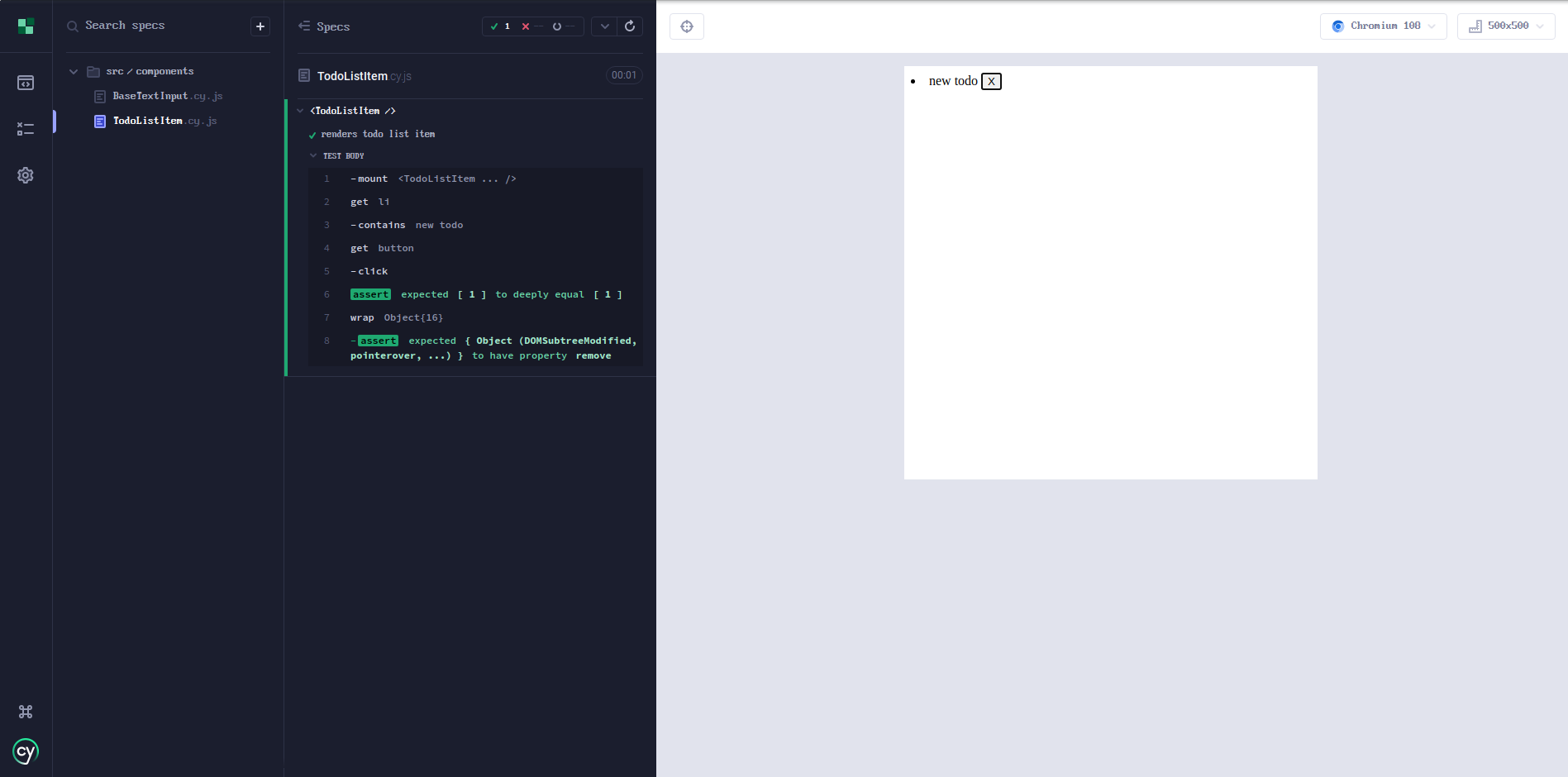 });To run the test, launch Cypress using cypress:open. Select “component testing” again, then click on TodoListItem.cy.js to run tests.
